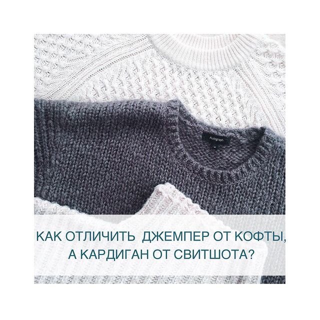 А вы умеете отличать свитер от пуловера и джемпера? Если нет, тогда давайте разбираться 👇🏻 🌺 Кофта считается «прародительницей» всей вязаной одежды. Отличительные особенности: материал — трикотаж, длина до бёдер, наличие застёжки сверху донизу. Обычно у кофты не слишком высокий ворот, но и не слишком глубокий вырез. 🌺 Кардиган - разновидность кофты. Главные признаки: две полочки и V-образный вырез. Считается, что кардиган назван в честь английского генерала лорда Кардигана, которому приписывается изобретение этой одежды. Вязаный жакет на пуговицах без воротника поддевали под мундир солдаты: кардиган согревал и не стеснял движений. В женскую моду кардиган ввела в начале прошлого века Коко Шанель. 🌺 Свитер — вязаная из толстой пряжи одежда длиной до бёдер с длинными рукавами. Отличительная черта - высокий (от 5 см в высоту), закрывающий шею ворот. Интересно, что доктора рекомендовали его как «одежду для похудения»: чтобы сбросить вес, предписывалось заниматься активными физическими