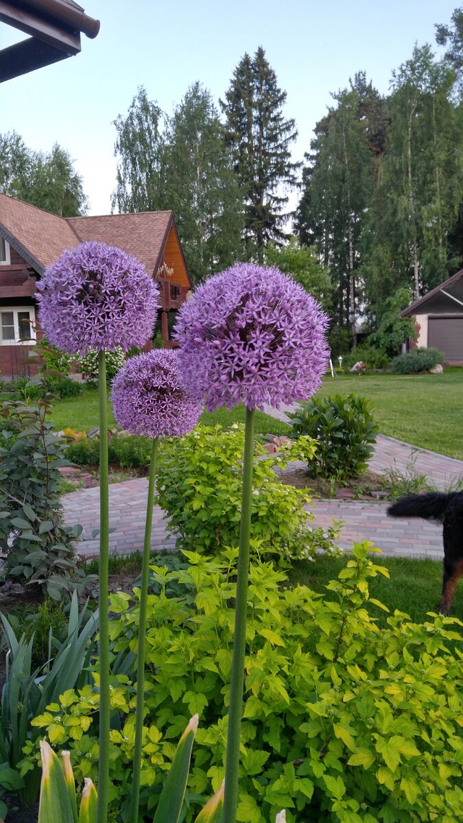 #Многолетние луковичные или с почти неразвитыми луковицами травянистые растения, некоторые — с резким луковым (или чесночным) запахом и вкусом. Представители рода имеют большую сплюснуто-шаровидную луковицу , покрытую красноватыми, белыми или фиолетовыми оболочками. "Стебель толстый, до 1 м в высоту, вздутый". Алиму хороший #медонос "Цветки мелкие, невзрачные, располагаются на длинных цветоножках, собраны в зонтиковидные соцветия, в молодости заключённые в чехол, которые у некоторых видов достигают 40 см в диаметре" ///. Мы садоводы и любим аллиум за эти "мелкие невзрачные цветки", но собранные природой в волшебные шары Куда спрятать листья аллиума "Листья линейные или ремневидные, прикорневые, дудчатые////" Ландшафтные дизайнеры "бьются" как спрятать листья аллиума и показать во всей красе "волшебные шары" "стебель толстый, до 1 м в высоту, вздутый" . Стебель "поддчеркивам" на клумбах . На фото 2-х летняя клумба - на следующий год подрастет лапчатка и хв