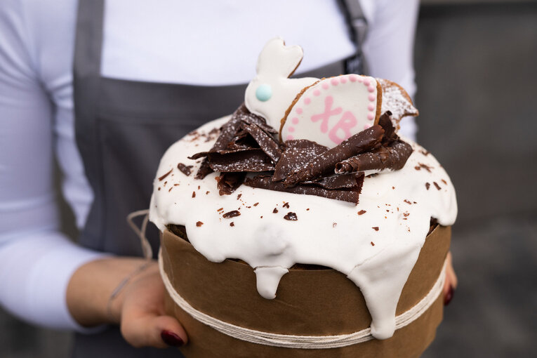 Кулич приготовлен бездрожжевым способом на пшеничной закваске с несколькими длительными стадиями ферментации, на яичных желтках и сливочном масле из новой Зеландии с добавлением дробленого темного 52% шоколада, золотого изюма, апельсиновых цукатов. Куличи можно заказать в красивых праздничных наборах: в большой набор будет входить два кулича (большой шоколадный (500г) и средний цитрусовый (300г), а также 10 золотых яиц (4.000₽, а в набор поменьше – цитрусовый кулич с изюмом (300г) и 5 серебряных яиц (2.600₽).