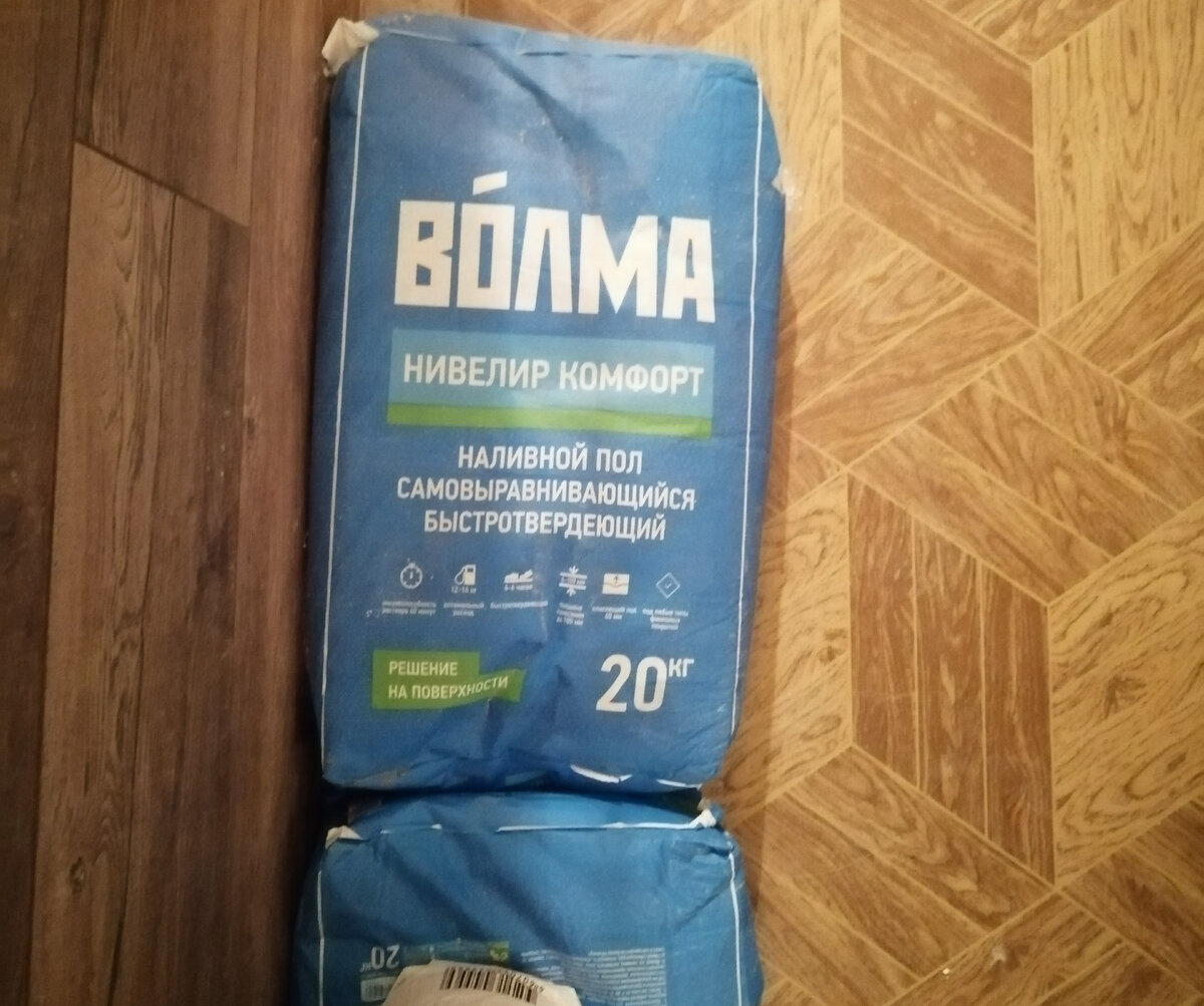 В моем случае полы были не особо кривыми и почти по уровню 1-3мм максимум перепады, но я все же решил использовать перед укладкой керамогранита наливной пол. Полистав сайт магазина Леруа Мерлен, каталог наливных полов и почитав отзывы, остановился на "Наливной пол Волма Нивелир комфорт (упаковка20 кг)" . Посчитал площадь залива, вышло 6 квадратных метров, приобрел 3 упаковки пола по 20 кг, там же взял насадку для дрели миксер, замешивать смесь и пластиковое ведро 20 литров.