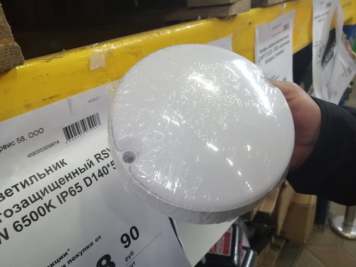 А увидели мы вот такой интересный светильник пылевлагозащищенный(так и было написано на ценнике) RSV SPP 12 W 6500К 140*55 по цене 148.90 рублей.