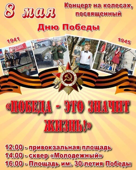 Стать зрителями “Концерта на колесах” жители и гости города могут 8 мая: 12.00 - привокзальная площадь; 14.00 - сквер «Молодёжный» ( район ЗАГСа); 16.00 - Площадь им. 30-летия Победы.