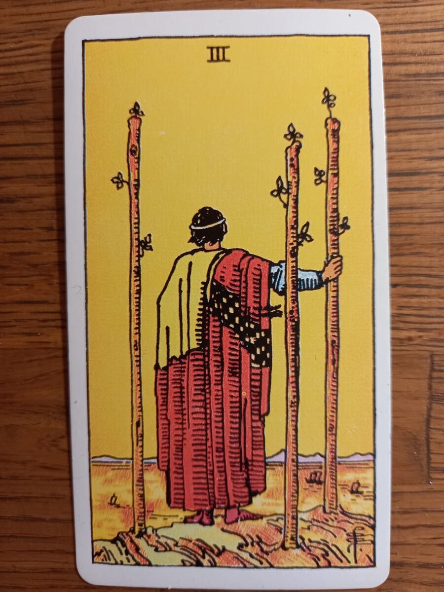 Тройка жезлов - применение воли не только на собственные нужды, но и на нужды общества - это классическая трактовка. Но я вижу в этой карте молодого, уверенного в себе и в своих действиях человека. Он уже видит свой путь и он знает, что этот путь будет удачным! Последние приготовления и выдвигаемся!
