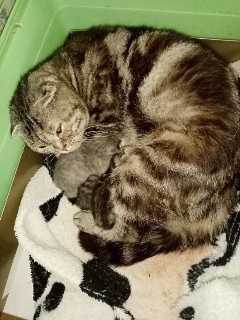 Обычная история, глубоко беременную кошку сдали в приют по причине отъезда (на Луну наверное). Мы приняли кошку в субботу и сразу записали на экстренную стерилизацию, но не успели. Кошка решила сохранить своих деток и принесла в ночь с воскресенья на понедельник пятерку бегемотиков. Один не выжил. А четверка чувствует себя прекрасно.