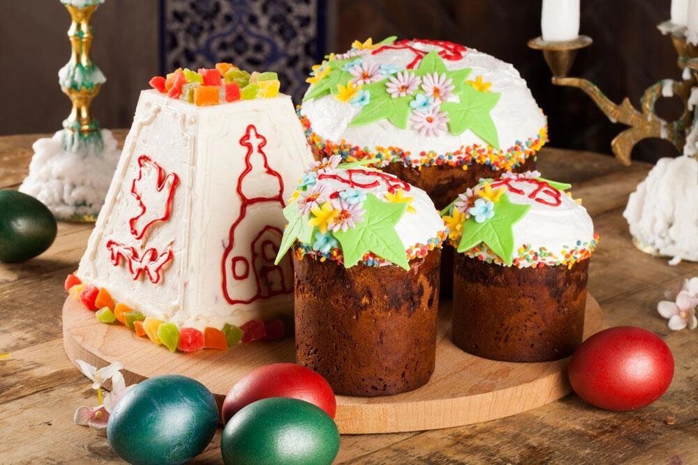 Традиционным угощением на Пасху являются окрашенное яйцо, кулич и творожная паска.