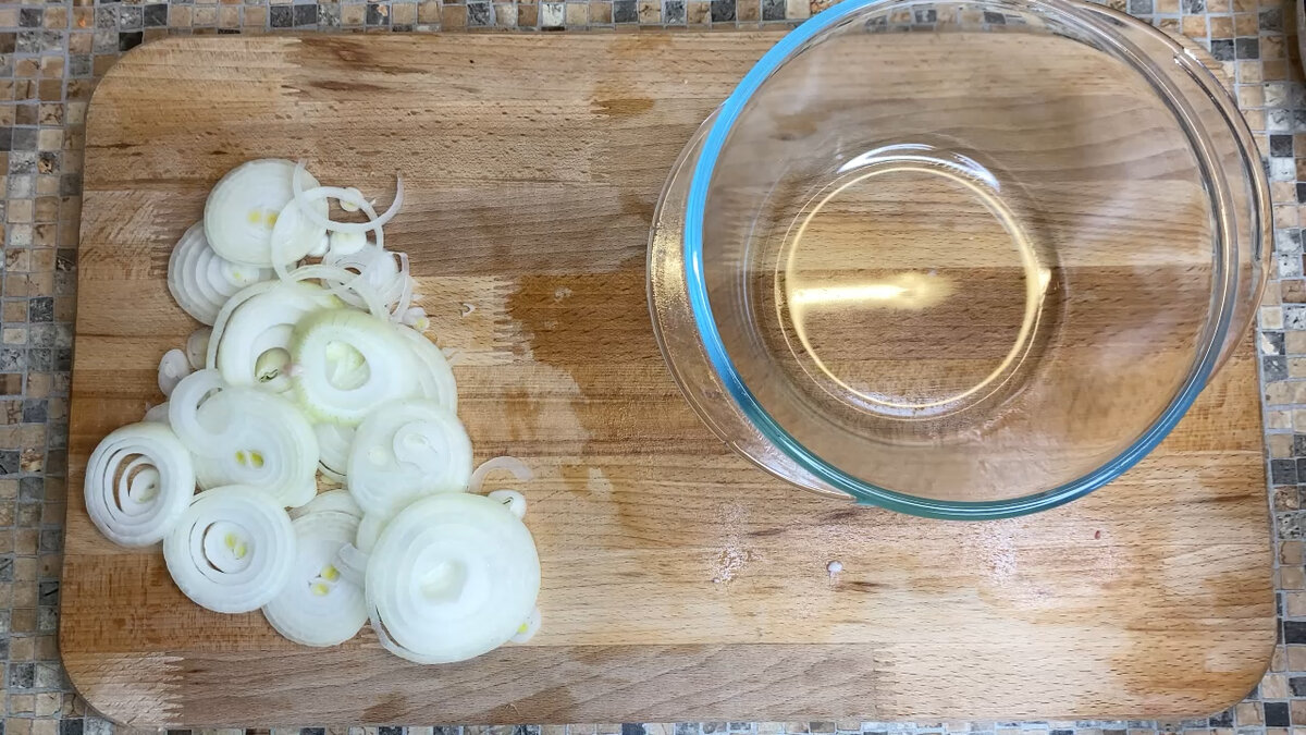 Начнем с лука. Режем его произвольно. На пол кило сердец возьмите 2-3 луковицы.
