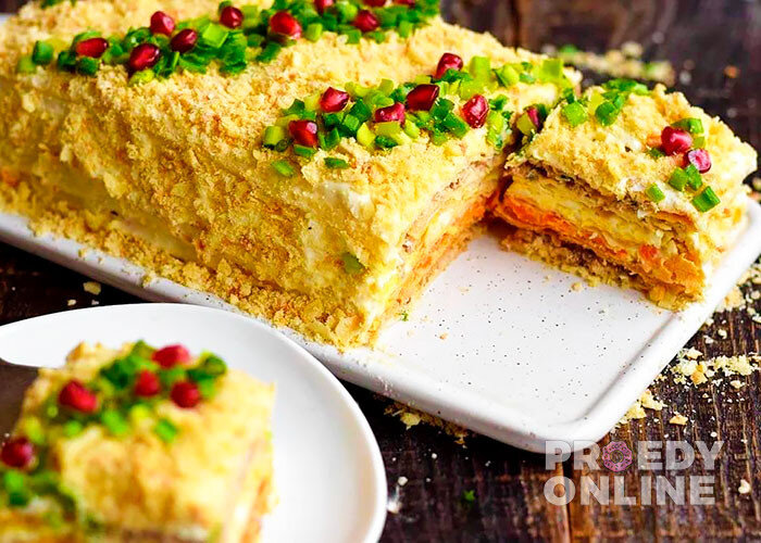 Так как коржи пропитаются и станут мягкими, закусочный торт Наполеон легко нарежется на порционные кусочки и не будет крошиться. Подавайте его на красивом блюде.