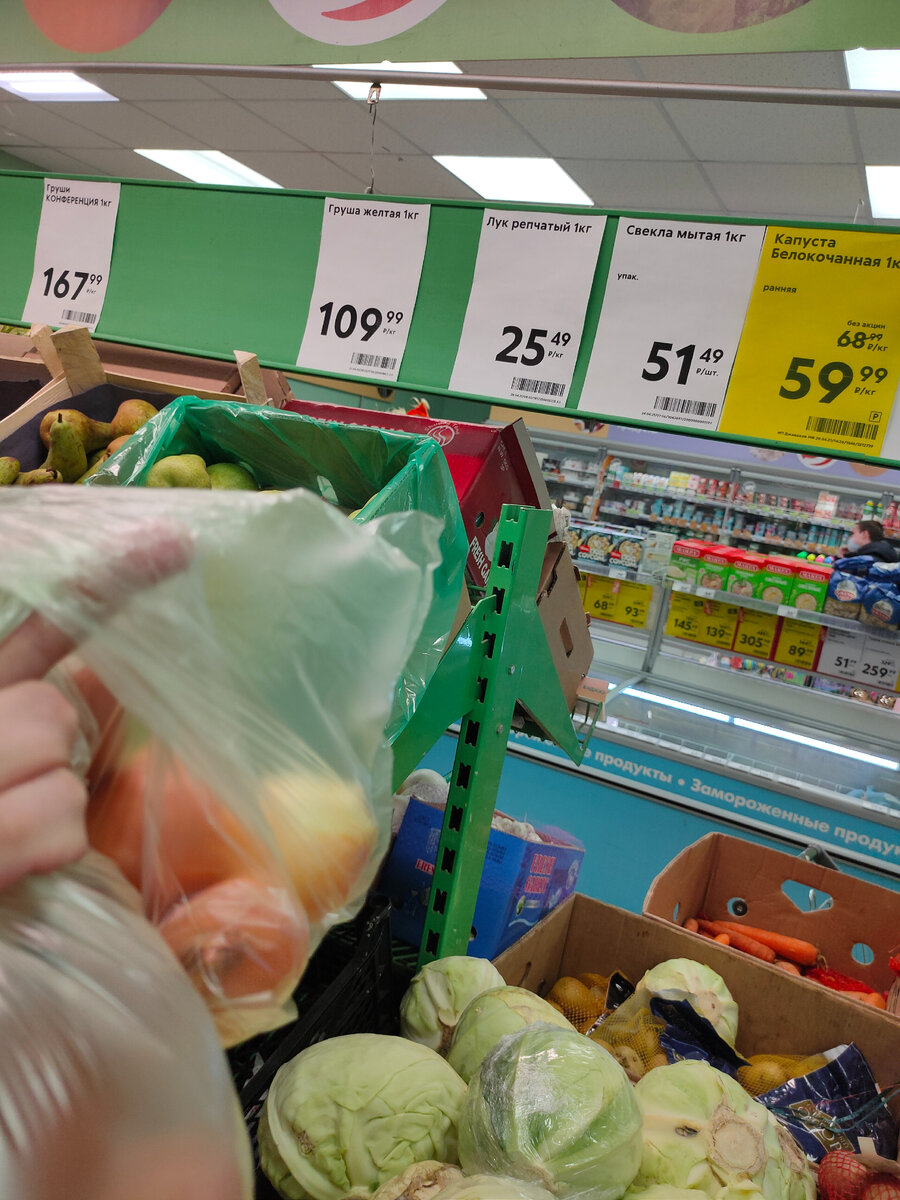Всем привет! Меня зовут Алексей. Рад приветствовать вас на канале Экономный хозяинъ. Сегодня расскажу о своих покупках в Пятерочке на этой неделе. Магазин находится в Москве. Цены действительны с 27.04.21 по 03.05.21. Начнем с моих покупок овощей и фруктов. Купил немного репчатого лука и моркови. Лук сейчас стоит 25,50, а морковь грязная стоит 35 рублей за килограмм. Бананы с прошлого раза подорожали на 2 рубля. Теперь они стоят 66 рублей за килограмм. Так как в воскресенье Пасха, купил 2 разных кулича. Один стоил 160 рублей, от Хлебзавода №28, второй Коломенский за 200 рублей. Есть выбор от маленького до больших и в коробках. Я взял за среднюю цену. На одном наклейка что освящен. Купил два вида варенья. Это черника протертая и малиновое варенье Варенька. Черника стоила 95 рублей за банку 350г. Малиновое варенье стоит 99 рублей за банку 380г. Это цены без акций, по акции цена в районе 80 рублей. В холодильниках с охлажденным мясом купил тушку курицы по цене 138 рублей за килограмм. Так