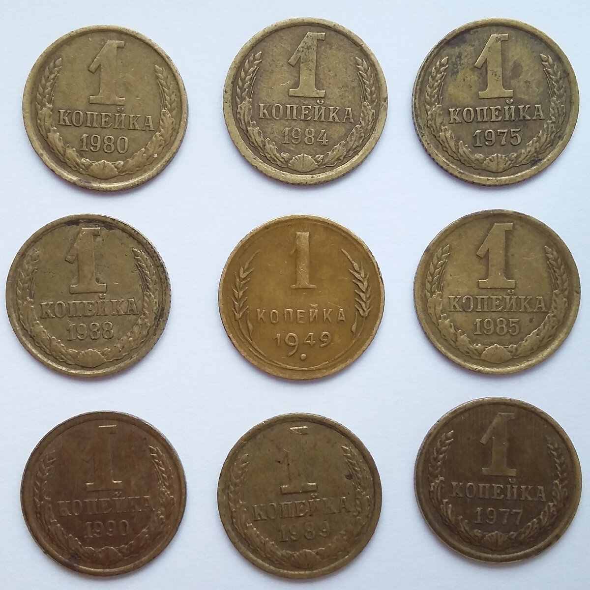 Перебирая советскую мелочь, которая годами лежала в закромах, обнаружил несколько копеечных монет: А среди них нашлась вот такая: Реверс В центре номинал "1", ниже надпись "копеек" ещё ниже год чеканки "1949". Можете посмотреть видео-обзор монеты: Аверс На аверсе в нижней части расположен диск солнца с венчиком, выше и в центре - герб СССР - опоясанный лентой из 16 витков - это число стран, которые на тот момент времени входили в состав СССР. Гурт - рубчатый. Вес монеты: 1 грамм Диаметр монеты: 15 мм Толщина монеты: 0.9 мм Металл изготовления: Бронза Обозначение металла: Cu-Al Есть ли редкие разновидности? Определяем разновидности по каталогу Федорина Аверс шт 1.2 Как отличить? 1 копейка 1949 года шт. 1.2 - под бойком молота нет меридиана: Стоимость 1 копейки 1949 года шт. 1.2 доходит до 100 000 рублей в исключительной сохранности. Аверс шт 1.3 Как отличить? 1 копейка 1949 года шт 1.3 Стоимость 1 копейки 1949 года шт. 1.3 доходит до 4000 рублей в исключительной сохранности. Аверс шт 1