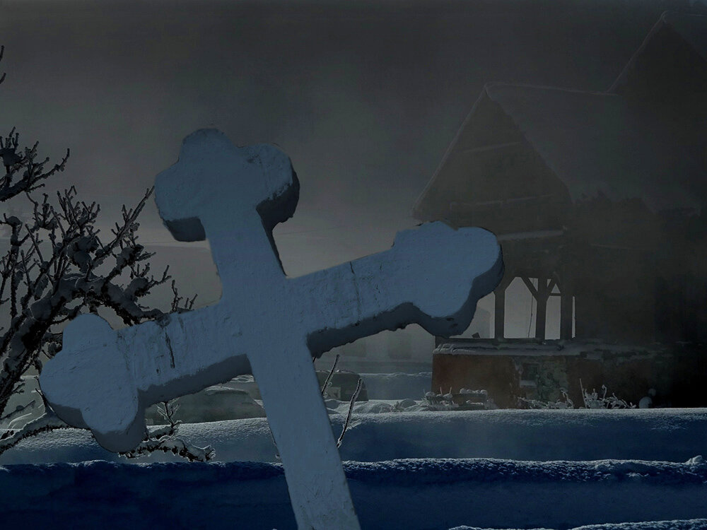 Выйдя на широкую главную улицу, мы пошагали мимо молчавших домов. Я не сразу осознал, в чём их странность, пока не сообразил, что рядом с избами растут большие деревянные кресты. Наконец Макар остановился около маленького скошенного влево строения и постучал в окно.