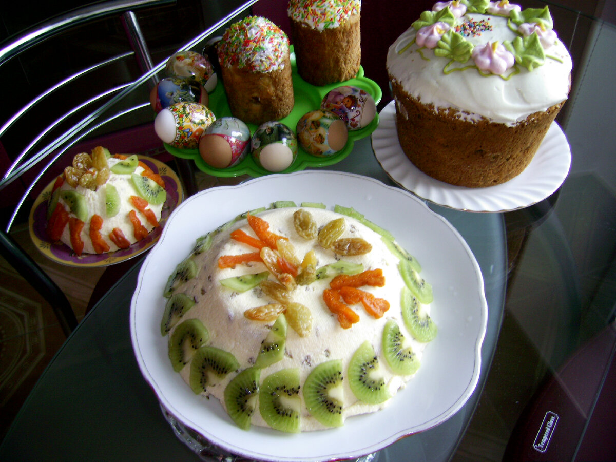Для неё нам понадобятся полкилограмма творога (желательно домашнего, рыночного), 1 пачка размягченного сливочного масла, 4 столовые ложки сметаны (тоже лучше домашней), полстакана сахара, 2 яичных желтка, 1 стакан орехов (грецких, лесных, миндаля, кому что нравится, но непременно – подсушенных в духовке и очищенных), 1 стакан изюма, ванилин. Творог, масло, сметану, сахар, желтки – взбиваем в однородную массу, добавляем орех, изюм, перемешиваем, не забываем ванилин. Выкладываем в форму. Если специальной разъемной формы нет, массу для пасхи выкладываем в выстеленные влажной марлей миски или кремовницы, слегка утрамбовываем. Даем застыть в холодильнике, затем аккуратно переворачиваем на тарелки, марлю снимаем. Пасхальные творожные горки украшаем, насколько хватит фантазии.