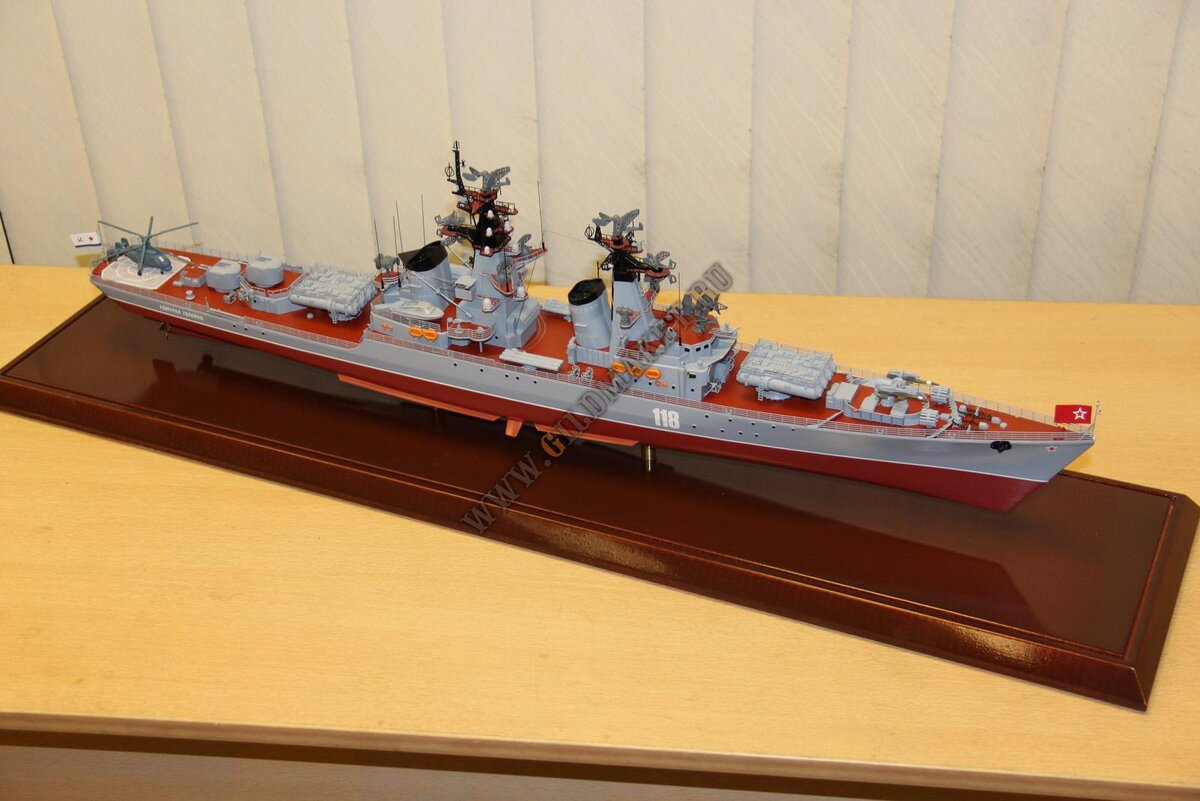 Весьма регулярно мы получаем заказы на изготовление памятных сувенирных моделей и макетов. Работа над такими, как всегда, уникальными, подарками несёт в себе особую изюминку. Осознание того, что судьба, а то и жизнь человека, связана с объектом макетирования, заставляет нас нести высокую ответственность и подходить с более строгим мерилом к результату нашего кропотливого труда. Так и в этом случае. Мы изготовили сувенирную подарочную масштабную модель советского ракетного крейсера «Адмирал Головко», проекта 58, он же тип «Грозный». Заказ поступил от сослуживцев одного из старших офицеров этого прославленного боевого корабля ВМФ СССР. Нужен был настоящий памятный подарок! И мы справились с поставленной перед нами задачей. Обратите внимание на высокую степень детализации судомодели. Проработаны все, даже самые мелкие нюансы. На кормовой вертолётной площадке установлена масштабная модель штатного корабельного вертолета Ка-25ГЦ. Модель крейсера «Адмирал Головко» выполнена в масштабе 1:200,