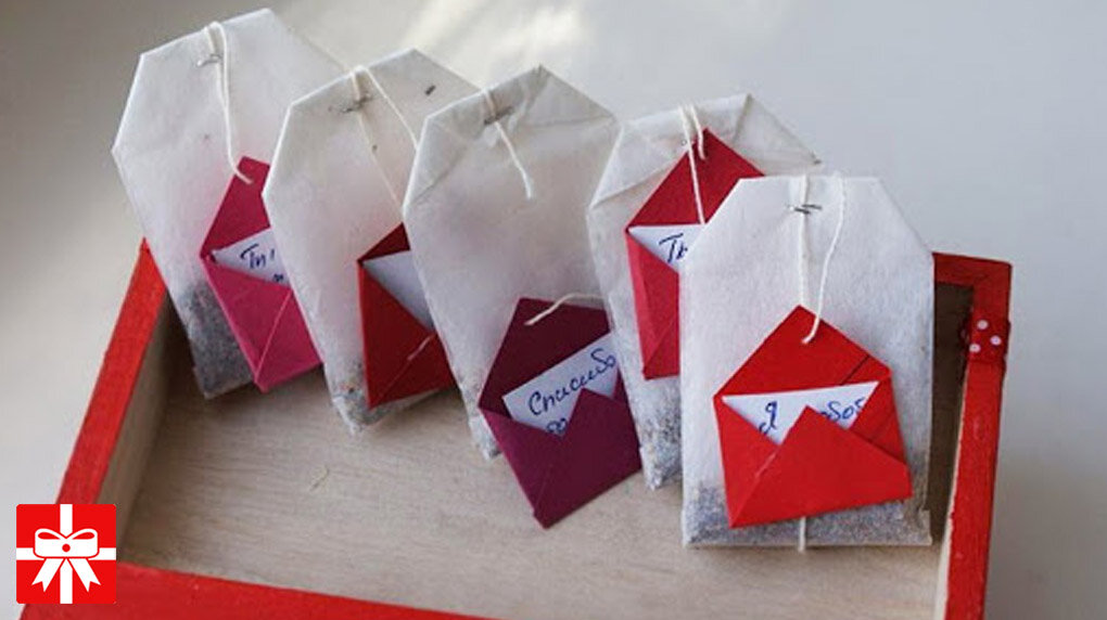 На каждый чайный пакетик крепим степлером записку с небольшим пожеланием, мотивирующей фразой и т.д. Размер записки около 5х5 см, если длинное пожелание, то в длину можно 10 см, сложите вдвое. В идеале найти миниконверты.