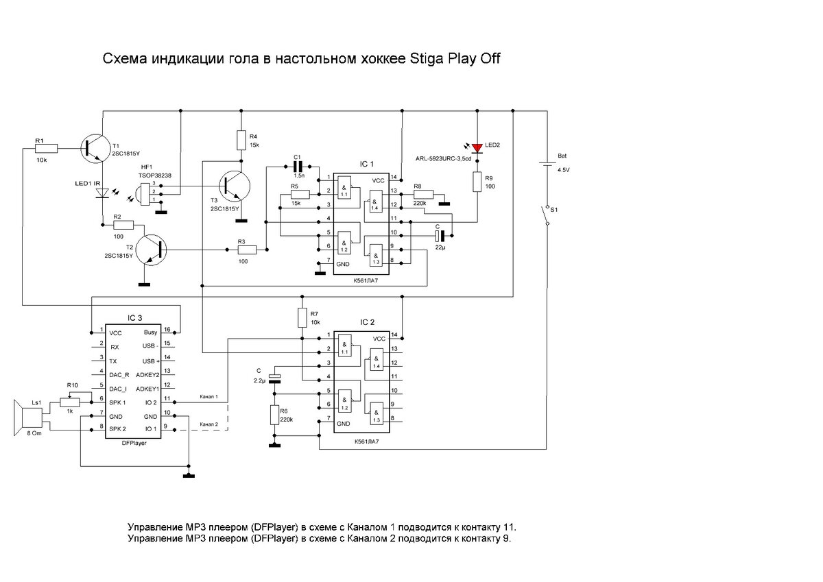 Когда шайба попадает в ворота, то она перекрывает инфракрасный луч, направленный от ИК-диода LED1 к ИК-приёмнику HF1. При этом на выходе 3 ИК-приёмника HF1 потенциал низкого уровня изменяется на потенциал высокого уровня, вследствие чего транзистор Т3 открывается. «Минус» источника питания через открытый переход коллектор-эмиттер транзистора Т3 подаётся на вывод 9 микросхемы IC 1 и на вывод 2 микросхемы IC 2. При этом на выводах 8 и 11 микросхемы IC 1 и выводах 1 и 4 микросхемы IC 2 возникает потенциал низкого уровня. Это приводит к тому, что светодиод индикации гола LED2 начинает светиться в течение примерно 3-х секунд, а на управляющий контакт мини-плеера mp3 (DFPlayer mini) поступает короткий импульс низкого уровня, длительностью менее 0,5 сек.