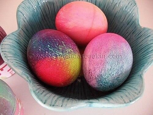 1. Чтобы получить красивую сетчатую цветную поверхность, нужно завернуть яйцо в мокрую марлю. Концы марли зафиксировать резинкой. На марлю наносить капли краски различных цветов. Высушить и снять марлю. Для второго способа окрашивания яиц подготовить бумажное полотенце и жидкие пищевые краски. На мокрое бумажное полотенце нанести каплями несколько цветов краски. Этим полотенцем обмотать яйцо. Если краска будет плохо распространяться на поверхности, брызнуть водой. Аккуратно отжать излишки воды и краски. Яйцо в бумажном полотенце положить в лоток, чтобы высохло. Снять бумажное полотенце с высохшего яйца. 2. Яйцо с фигурными полосками. Фигурными ножницами нарезать полос скотча или клейкой ленты, обернуть яйцо и покрасить. Когда высохнет, снять ленту. 3. Яйца покрасить в пастельные тона и высушить. Развести с водой тёмно-коричневый акрил и с помощью зубной щётки брызгать на яйцо. Чтобы тёмные точки на яйце получились аккуратными, нужно стряхнуть излишки краски и воды на газету, а пото