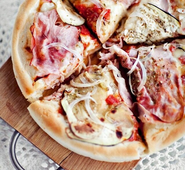 ИНГРЕДИЕНТЫ 1 и 1/2 стакана негазированной воды (например, родниковой или минеральной воды, или простой воды) 40 г свежих дрожжей 2 чайные ложки сахара 600 г пшеничной муки 4 столовые ложки дополнительного масла + смазывать тесто и противни 1 полная чайная ложка соли ДОБАВКИ: 8 ломтиков тонко нарезанной тонкой и тонкой ветчины около 1/2 баклажана 1/2 луковицы сушеный орегано СЫРЫ: 1 шарик белой моцареллу около 100 г тертой моцареллу около 100 г сыра камамбер ТОМАТНЫЙ СОУС СО СВЕЖИМИ ПОМИДОРАМИ: 4 помидора 1 столовая ложка оливкового масла 1 столовая ложка сушеного орегано ПОДГОТОВКА Половину воды следует слегка подогреть в кастрюле (она должна быть только теплой, но не горячей). Добавить в воду измельченные дрожжи (их нужно нагреть до комнатной температуры) и сахар, перемешивать до растворения дрожжей. Отставить на 5-10 минут (дрожжи начнут вспениваться). За это время нагрейте остальную воду (она должна быть такой же теплой, как и раньше). Просейте муку на кондитерской доске или в боль