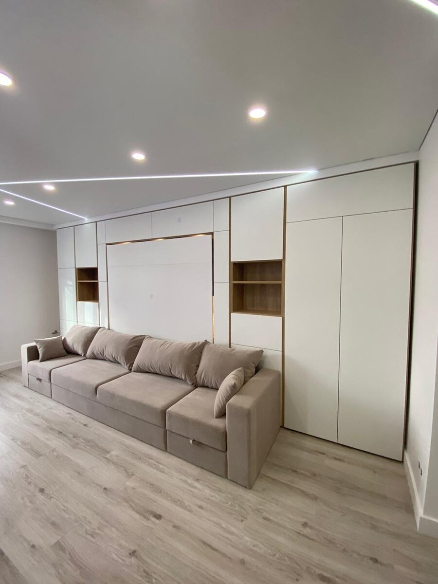 Как превратить стену в обычной комнате в супер функциональную жилую систему, использовав минимум пространства? Рассмотрим монтаж, в котором была реализована эта идея. Заказчиком была поставлена задача: максимально задействовать пространство стены, чтобы освободить больше места в комнате без потери необходимого для жизни функционала. Задача усложнялась тем, что комната используется одновременно, как спальня и как гостиная. Применив возможности мебели трансформер Olissys, нам удалось разместить вдоль одной стены кровать-трансформер, два платяных шкафа, два стеллажа и большой четырехместный диван с функцией хранения. Глубина всей системы хранения составляет всего 327мм. На фасадах используются механизмы Push to Open– открытие от нажатия, благодаря этому достигается эффект единой многофункциональной стены. Спальный модуль трансформер находится в центре композиции и позволяет за несколько секунд превратить гостиную в комфортную спальню. Как и во всех флагманских моделях, изголовье спального