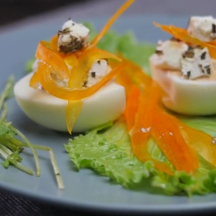 - половинки белков выкладываем на листья салата, заполняем их сырной пастой и украшаем тонкими ломтиками перца, сверху можно добавить целые кусочки Шевра.