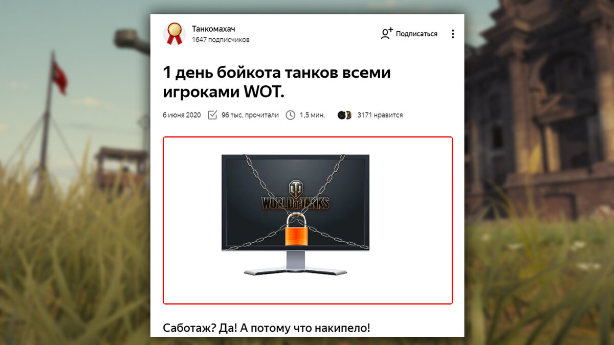 У игроков накипело: надоели эти постоянные обновления, нововведения в игре, кривой баланс и издевательства разработчиков. Игроки твердят об одном, а разработчики у себя в офисе слышат совсем другое и вот, в итоге, получаем экипажи 2.0 и нерф техники. Но с настоящими проблемами никто бороться не хочет, их будто не замечают. По одиночке достучаться не получится, какие бы вы конструктивные замечания не составили и как бы не грозились "уйти из игры". Не велика потеря от одного, на вас даже внимания не обратят... У них ведь миллионы! (как людей, так и денег) Тогда в 2020 году игроки решили, что нужно объединяться. На одном из танковых каналов в Дзене - Танкомахач, выходит статья «1 день бойкота танкам всеми игроками», которая мгновенно получает огласку и популярность. Всего за пару дней ее просмотрели сотни тысяч танкистов! Автор пишет: Создатели игры могут нас услышать только в одном случае - если их уши не будут заткнуты нашими деньгами. А отсутствие игроков явно заставит задуматься. И ре