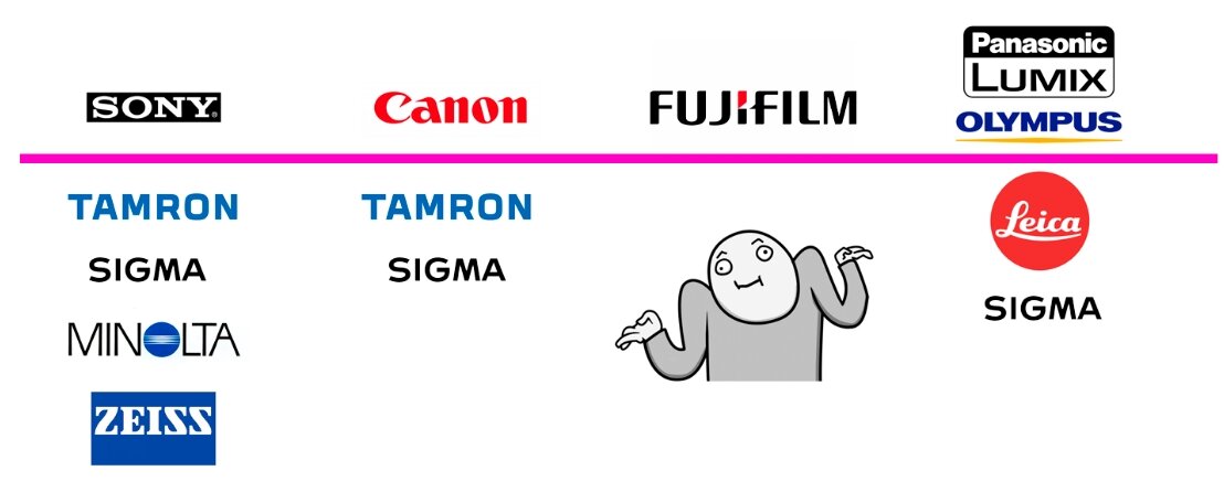 Самое главное в камере (кроме самой камеры) это обьективы, дак вот, сделал небольшую табличку о том, какие обьективы вы можете накрутить на свою камеру. Как видно - самый большой выбор на системе SONY, как бы не кусался ценник на сами тушки - выбор обьективов тут, действительно огромный.