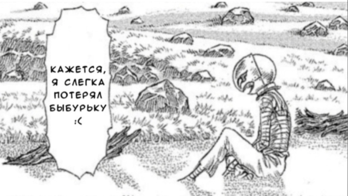 Как вы думаете, стал бы извращённый тюремщик, не постеснявшийся отрезать лучшему своему заключённому даже язык, оставлять в покое его член? Гриффит, абсолютно обнажённый, находился в Башне Вечности около года, и я сомневаюсь, что тюремщик не замечал его гениталии. Из чего вытекает вопрос: был ли Гриффит оскоплён? Как было в манге Лучше всего наличие члена доказало бы сношение, но это не наш случай. Незадолго до Затмения был один любопытный момент. Гриффит ложится на Каску, чтобы проверить, остались ли её чувства к нему прежними. В фильме 2013 он двигается, имитируя половой акт. Но нам больше интересно, что происходит в манге. Гриффит падает на Каску, Миура изображает соприкосновение их паховых областей. Обратите внимание на его руки. Сперва они разведены в стороны, но потом Гриффит обнимает Каску. Каска, как и в обеих адаптациях, просит его остановиться. Всё это означает, что Гриффит действительно собирался заняться с ней сексом, а этого нельзя было бы сделать без члена. Но предположим