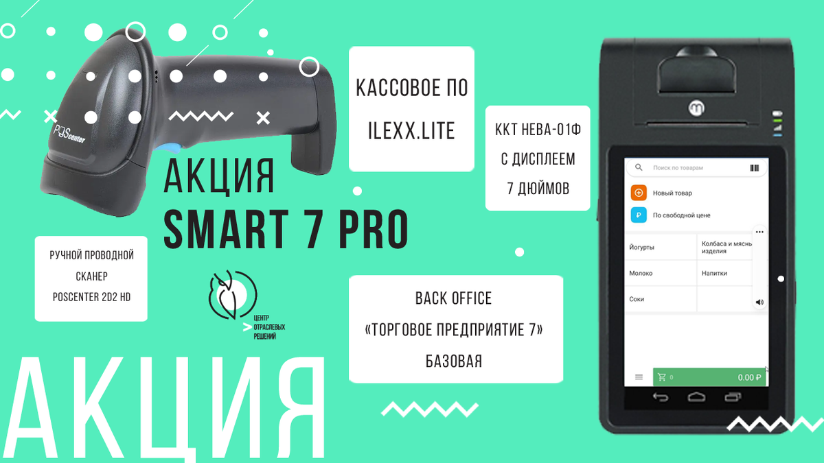 Коллеги, вашему вниманию предлагаем акцию, созданную совместно с нашими партнерами. Smart 7 Pro – это программно-аппаратный комплекс для автоматизации внутренних процессов в розничных торговых предприятиях с товарами, обязательными к маркировке. Что в него входит? 1. ККТ НЕВА-01Ф с дисплеем 7 дюймов Самая доступная модель на рынке, оптимальна для малого бизнеса. В комплекте с кассой идет аккумулятор, рулон ленты. Подходит для предприятий с маркированным товаром, исключая аптеки. В автономном режиме работает до 16 часов, в режиме ожидания – до 5 дней. 2. Ручной проводной сканер Poscenter 2D2 HD Лидер на рынке среди бюджетных решений. Подходит как для средних, так и для крупных предприятий розничной торговли. Позволяет считать проблемные штрихкоды без вскрытия упаковки. 3. Кассовое ПО ilexх.lite Оптимально для малого и среднего бизнеса, работает на Android. Позволяет определять стоимость продажи в момент совершения сделки. ПО работает со всей маркировкой, исключая лекарственную. Для касс