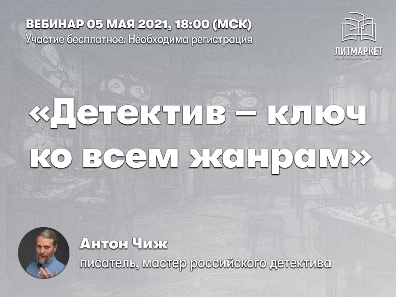 5 мая 2021 года, в 18:00 (МСК), портал «Литмаркет» приглашает всех желающих на бесплатный вебинар мастера детективного жанра - Антона Чижа. Мы приглашаем вас на бесплатный вводный вебинар интенсивного воркшопа. На нем мы разберем:
