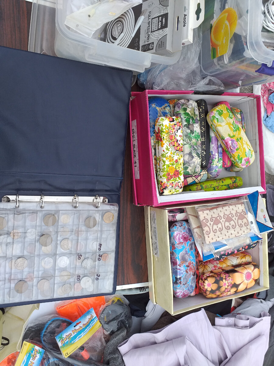 Барахолки Ростова-на-Дону. Ярмарка товаров бывших в употреблении за рынком, а точнее торговым комплексом Привоз. Статья 009. Здоровья Вам, мои дорогие читатели. Девятая статья. Ещё поход на барахолку Ростове-на-Дону. На это раз я нашёл точку на которой торгует человек с очень большим количеством нового товара. Один из тех, кто закрыл обычный магазин и распродает остатки товара. Я уже писал о таких явлениях на барахолке. Половина его точки наполнена новыми товарами, много-чего не распаковано и лежит в сумках и коробках. То, что я запомнил: 1. Очки – диоптрия. 2. Футляры для очков. Купил себе один для компьютерных очков. 3. Чехлы для телефонов. 4. Кабеля микро – USB. 5. Кабеля на Айфон 5-. 6. Чехлы на телефоны. 7. Сумочки для очков. 8. Чехлы для кнопочных телефонов (тут конечно покупателей с каждым годом всё меньше и меньше). 9. Монеты. 10. Банкноты. 11. Детские плавательные наборы: Ласты, трубки, маски. 12. Детские носочки. 13. Ну и одежда конечно тоже есть. И ещё говорит дома в три р