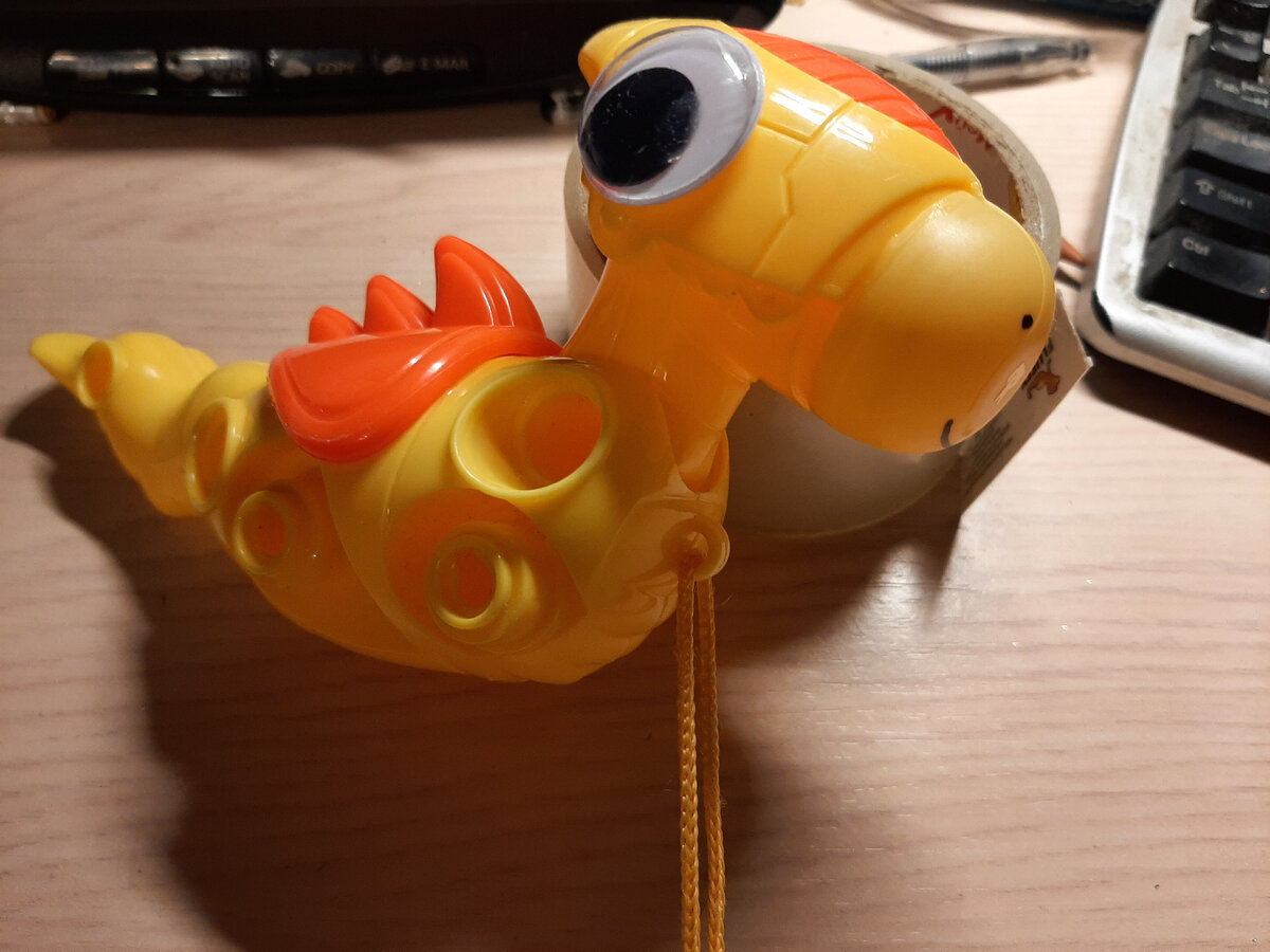 Недавно моя тётя передала нам целый пакет игрушек для моей племянницы, которая часто у нас с родителями гостит. Игрушки были не первой свежести, опять таки остались от других племянников, и разной степени поношенности. Каким-то нужно было просто вставить батарейки, каким-то заменить стёршиеся глаза или приклеить крышку для батареечного отсека. Но был среди этих игрушек и такой экземпляр, с которым я изначально даже не знала, что делать. Судя по всему это была каталка динозаврик, но без глаз и морды (этот изначальный этап я, к сожалению, забыла сфотографировать), колёс тоже не было, зато были три сквозные дырки непонятно для чего. Динозаврик шёл безо всех сопутствующих деталей. Но всё-таки, подумав и покопавшись в некоторых вещах, я нашла замену этим деталям. С глазами было проще всего - у меня уже имелись готовые для кукольных поделок, и их нужно было просто приклеить. Мордочку я сделала из половинки от футляра Киндер Сюрприза с нарисованными ноздрями и ротиком. Дырки заделала подходящ