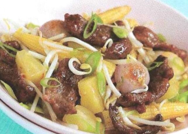 - Добавьте лук и чеснок в вок и жарьте, помешивая, в течение 5 минут до их размягчения. Добавьте молодую кукурузу, затем обжарьте еще 5 минут. Добавьте ананас, зеленый лук и проростки фасоли и обжарьте еще 3-4 мин. Добавьте сливовый соус.