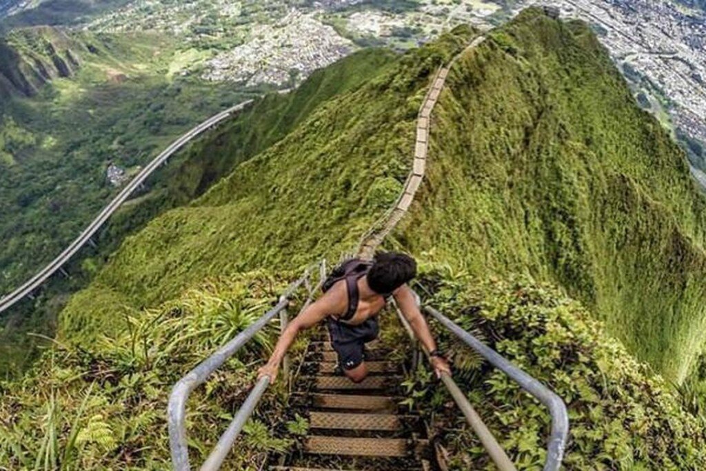 Тропа Хайку — лестница в небеса на Гавайях. Хотели ли вы когда-либо подняться в небеса? А сделать это пешком? А по лестнице? Да-да, можно и так! На Гавайях есть самая настоящая лестница в небо. Но в настоящее время она настолько опасна, что может быть вскоре закрыта навсегда. В настоящее время это излюбленное место туристов уже внесено в черный список «запрещенных подъемов». Лестница в небо. Гавайи, Оаху (Фото @migueltoralba) Лестница в небо, также известная как тропа Хайку, состоит из 3922 ступеней чистого адреналина. Эти, кажется, бесконечные ступеньки ведут к вершине живописнейшей горы на острове Оаху на Гавайях. Лестница в небо. Гавайи, Оаху (Фото HEWENTTOJARED_) Вид с вершины открывается просто потрясающий, что и привлекает людей со всего мира на эту экстремальную лестницу. К сожалению, из-за аварийного состояния достопримечательности, обвалов на некоторых участках горы и связанного с этим множества звонков в службу спасения 911 походы в горы здесь запрещены и, по сути, каждое вос