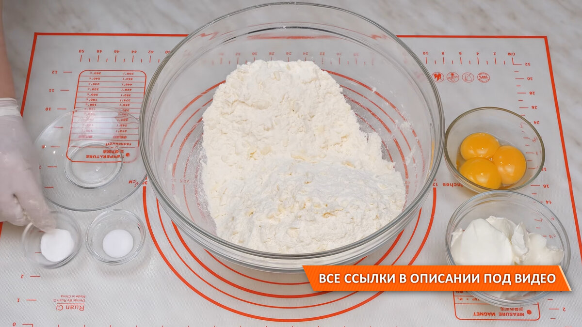 Туда же всыпаем 1/2 ч.л. соды, щепотку соли и снова все перетираем. Добавляем 3 желтка и 200 г сметаны, жирность значения не имеет. Замешиваем тесто.
