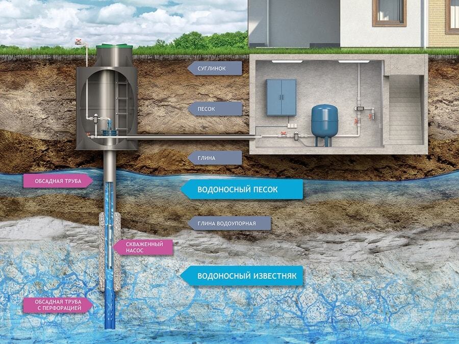 - артезианский (на известняк) – залегает на глубине 35-240 метров, дает чистую воду в неограниченных количествах, независимо от сезона. Скважина стоит дорого при бурении, но служит более 50 лет;