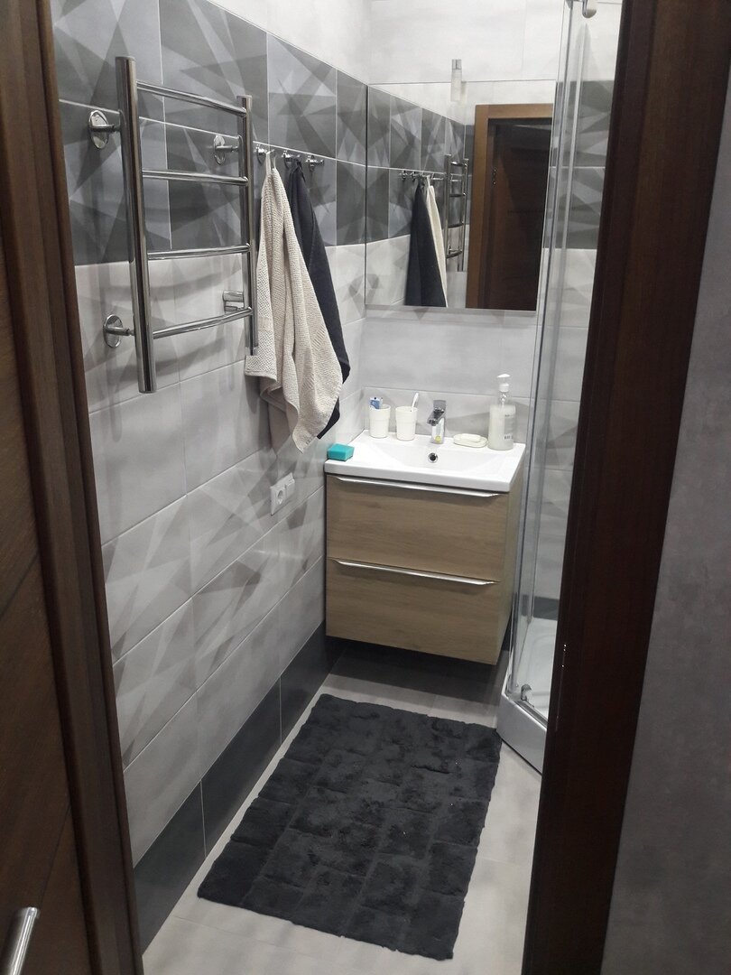 Привет! В ремонте маленькой ванной чаще всего одна главная задача - вместить всё, что нужно, да так, чтобы осталось место где развернуться. Порой хозяевам это удаётся с трудом, ведь на маленьком пространстве не так уж много вариантов размещения сантехники, как хотелось бы. Но некоторые варианты получаются настолько грамотно продуманными и удачно выполненными, что хочется показать их всем обладателям подобных маленьких ванных комнат и помочь с планированием небольшого пространства. Цветовую гамму хозяева выбрали в сочетании нескольких оттенков серого, причём плитку выбрали с геометрическим рисунком, который создаёт ощущение бОльшего объёма. На маленьком пространстве идея просто великолепная! Сразу со входа на левой стене виден полотенцесушитель, а напротив двери хозяева разместили небольшую подвесную тумбу с двум дверцами. Это даёт возможность получить хоть какое-то пространство для хранения. Раковину установили на тумбу, а над ней повесили зеркало. На м