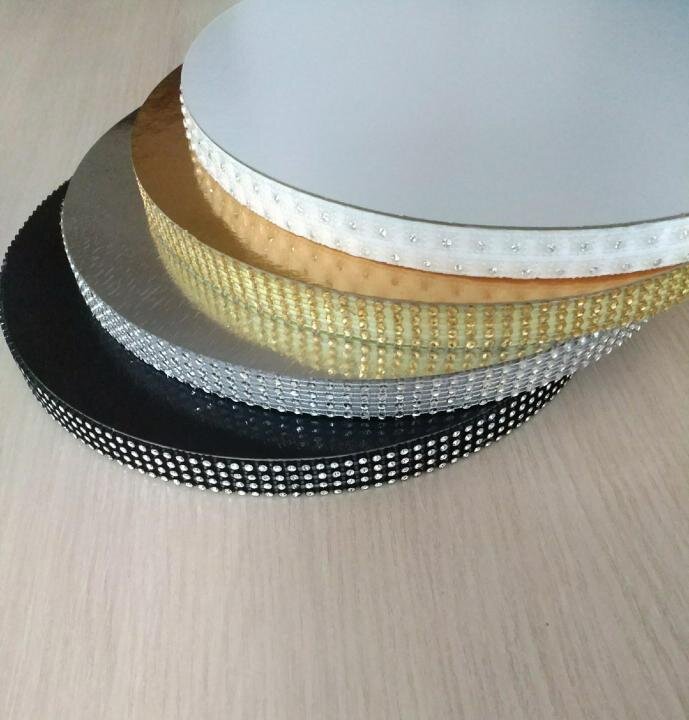 Теперь можно оформить подложку в зависимости от дизайна торта. Для декора можно использовать атласную ленту (ею обернуть край изделия), фольгу, мастику.