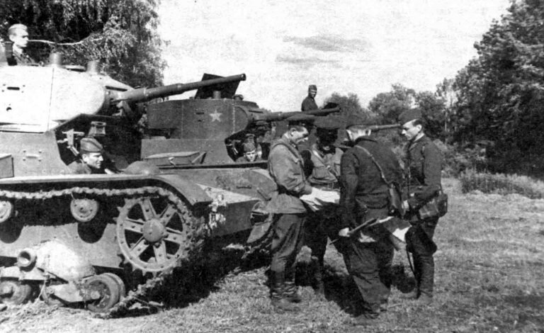 The last instructions before the fight. Crews of Soviet T-26 light tanks in the vicinity of Stalingrad. South-Western Front, 1942. The Battle of Stalingrad was the last combat operation of the Great Patriotic War, in which light T-26 tanks participated. By that time, these armored vehicles were already obsolete, mass production was stopped in 1940 (in 1941 they produced only 47 of these tanks), most were lost in the battles of 1941.