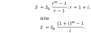 Результат является суммой геометрической прогрессии, первый член которой равен S₀, знаменатель — (1 + i ). Применив формулу суммы геометрической прогрессии, получим