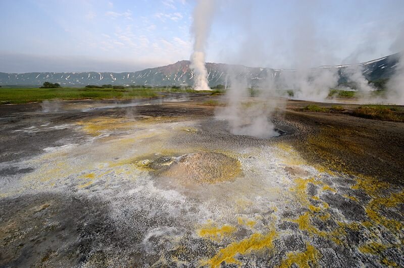 «Обычных» вулканов не бывает. Каждый из этих природных объектов необычен и интересен по-своему. Однако, есть среди них и особенно необычные. Просто уникальные. К таким объектам относится Узон на Камчатке. Не вулкан, а кальдера Прежде всего следует сказать, что Узон – это уже не вулкан, а кальдера. Так геологи называют котловину, которая возникает на месте многочисленных мощных извержений. Вулкан выбрасывает из себя магму, тонны раскаленного пепла, газы. И почва проседает в возникшую пустоту, образуя обширную котловину. Кальдера Узона имеет в диаметре от 9 до 12 километров, и занимает 100 квадратных километров площади. Уступы, окружающие кальдеру по краям, местами достигают высоты около километра. Самая высокая точка – Бараний пик – имеет высоту около 1600 метров. Первоначально Узон был конусовидным вулканом, и имел высоту около 3000 метров. Но приблизительно 40 тысяч лет назад серия грандиозных извержений превратила его в огромную впадину в земле. Сегодня Узон спит. Но он не потух. Ч
