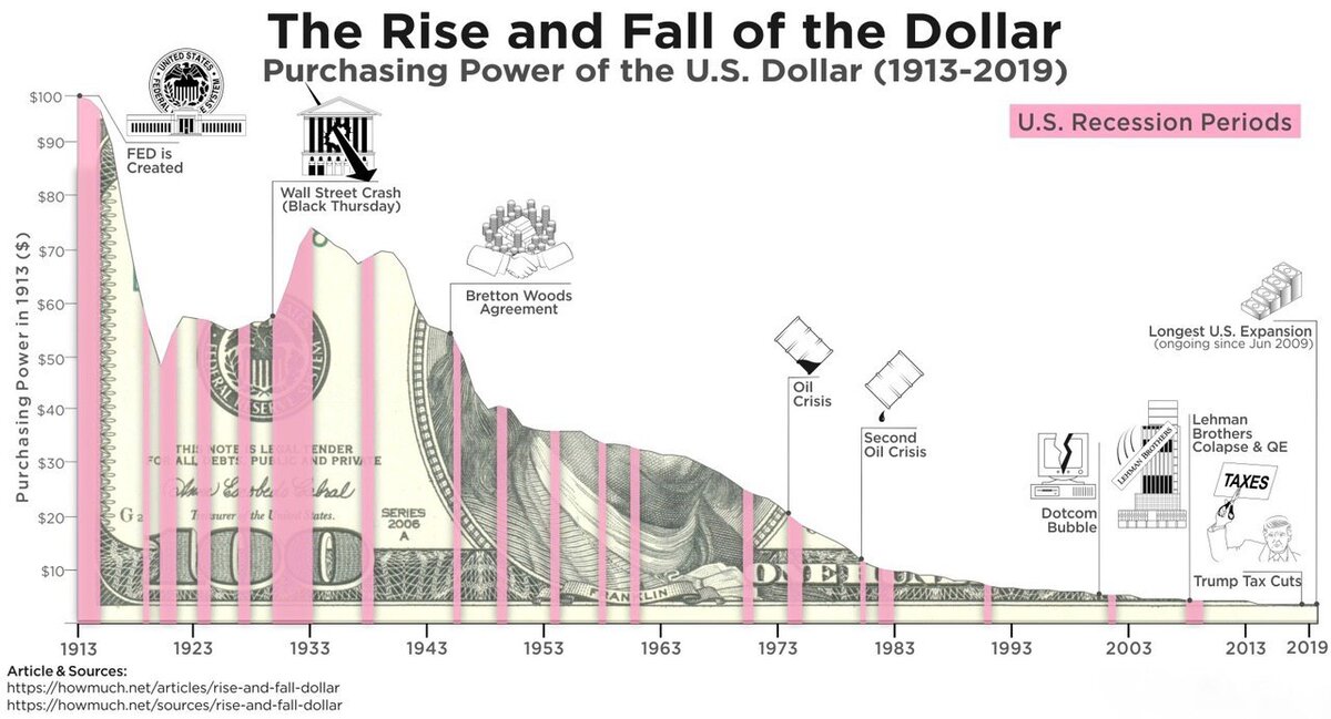 Визуализация покупательной способности доллара за последнее столетие Ни для кого не секрет, что сейчас 1 доллар даст вам меньше, чем 100 лет назад, но насколько снизилась покупательная способность доллара США за эти годы? Чтобы проиллюстрировать это, Howmuch создали визуализацию, которая демонстрирует рост и падение доллара с 1913 года. Используя этот график, мы можем видеть, как инфляция и изменения в индексе потребительских цен (ИПЦ) снизили покупательную способность доллара за последнее столетие. На графике видно, как с 1913 года изменилась покупательная способность или общий объем товаров и услуг, которые можно купить за один доллар. Кроме того, мы можем увидеть, как спады и крупные экономические события влияют на нашу покупательную способность. Покупательная способность доллара. Сколько стоит 100 долларов в 1913 году? 1913 год: 100 долларов 1923 год: 57,89 долларов 1933 год: 76,15 долларов 1943 год: 57,23 долларов 1953 год: 37,08 долларов 1963 год: 32,35 долларов 1973 год: 2