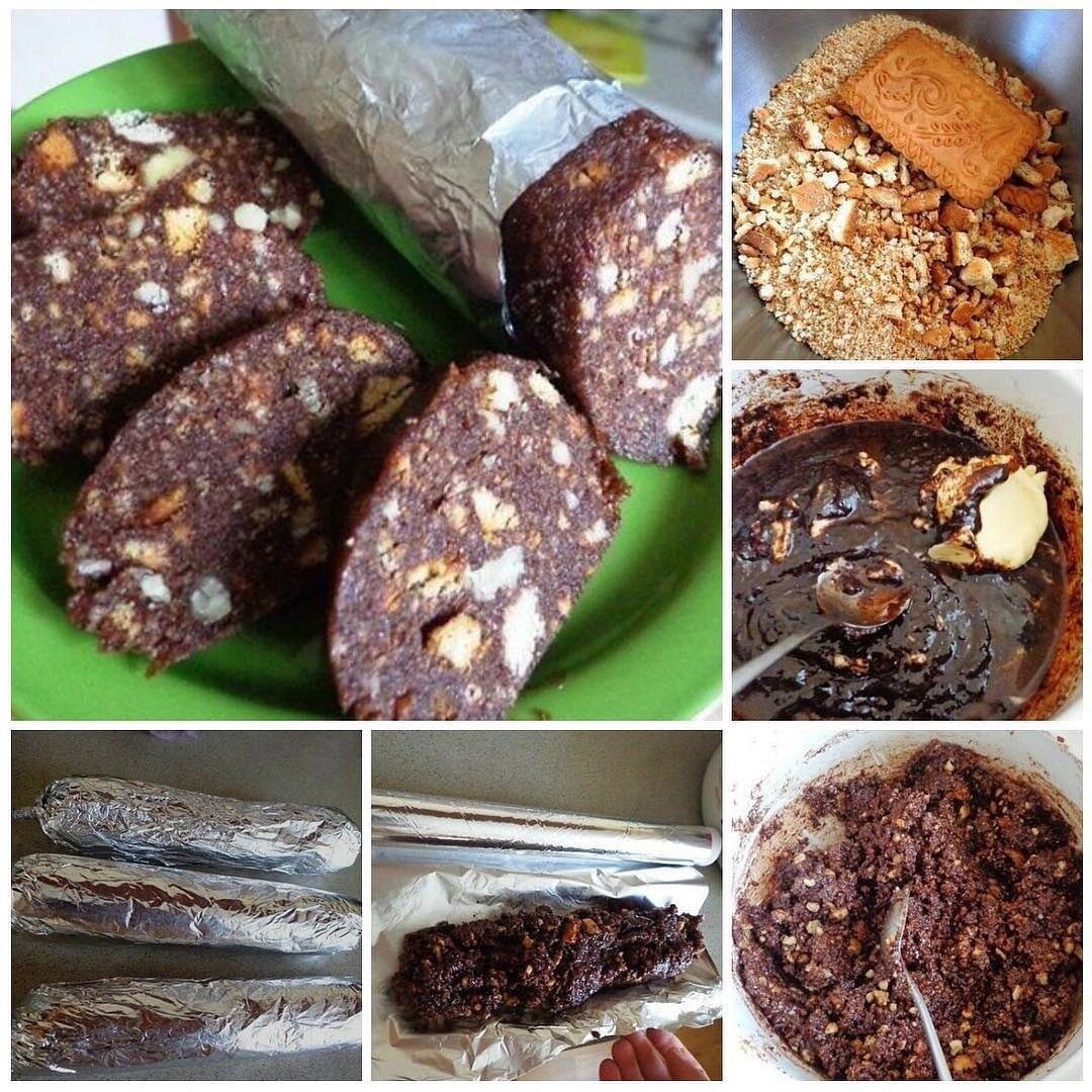Сладкая колбаска❤ ᅠ 📌Ингредиенты: ᅠ 🔸Песочное печенье – 300 г 🔸Сливочное масло – 200 г 🔸Орехи любые(арахис, грецкие) – 100 г 🔸Сахар - 1 стакан 🔸Молоко - 5 ст. л. 🔸Сгущенное молоко (вареное или обычное) - 5 ст. л. 🔸Какао - 3 ст. л. ᅠ ❇Приготовление: ᅠ 🔷1. Половину печенья измельчить в мелкую крошку, половину поломать мелко (я обычно все печенье кладу в пакет и сверху скалкой, так и крошка и нужные кусочки получаются). Орехи также измельчить скалкой можно или порубить ножом. 🔷2. Сахар, молоко, какао и сгущенку соединить, подогреть в кастрюльке, помешивать до растворения сахара, остудить немного. Затем добавить сливочное масло и все растереть до однородности. 🔷3. Постепенно в жидкую массу добавлять измельченные орехи и печенье. 🔷4. В итоге получается такая сладкая масса. Выкладываем часть массы на фольгу и формируем колбаску. 🔷5. Отправляем колбаску в холодильник на пару часиков, чтобы она затвердела. Всем приятного аппетита 😋 Если понравился рецепт - п