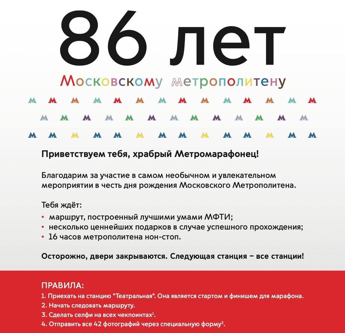 15 мая Московский метрополитен отмечает день рождения. В связи с этим москвичей пригласили принять участие в метромарафоне - проехать все станции метро и МЦК за один день. Участники марафона стартуют на станции метро «Театральная», а затем им нужно двигаться по маршруту, фотографируясь на станциях-чекпойнтах. Победители получат медали и уникальный коллекционный мерч мосметро. Прошлому рекордсмену удалось проехать все станции за 16 часов и 22 минуты.