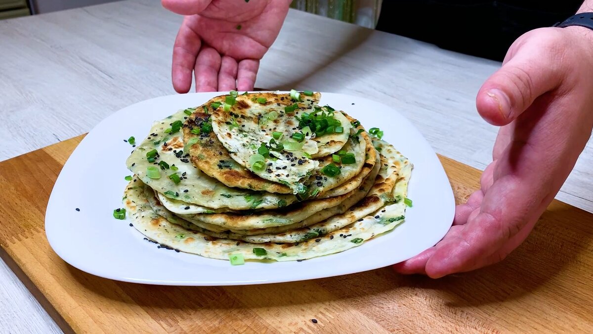 Всем привет! Сегодня готовим очень вкусный рецепт Китайских лепёшек Цун Юбин . Рецепт очень простой и отлично подойдет на замену обычного хлеба. ИНГРЕДИЕНТЫ: СПОСОБ ПРИГОТОВЛЕНИЯ Беру просеянную пшеничную муку, высыпаю в глубокую миску и добавляю стакан кипятка.Добавляем соль и начинаем тщательно замешивать тесто, делаем это очень аккуратно, так как смесь очень горячая ! После того как тесто остынет, можно его месить руками на припыленной мукой поверхности в течении 5 минут. Когда тесто станет гладким и эластичным, отправляем его обратно в миску и убираем в теплое место на 30 минут. Пока тесто отдыхает берем пучок зеленого лука и мелко нарезаем. По истечению 30 минут достаем тесто и еще раз хорошенько мнем в течении 2-3 минут. Отщипываем кусочек теста примерно как теннисный мячик и раскатываем скалкой в тонкий пласт. Наливаем капельку растительного масла и распределяем по тесту при помощи кулинарной кисти. Присыпаем тесто солью и посыпаем любыми специями, я добавляю прованские травы,