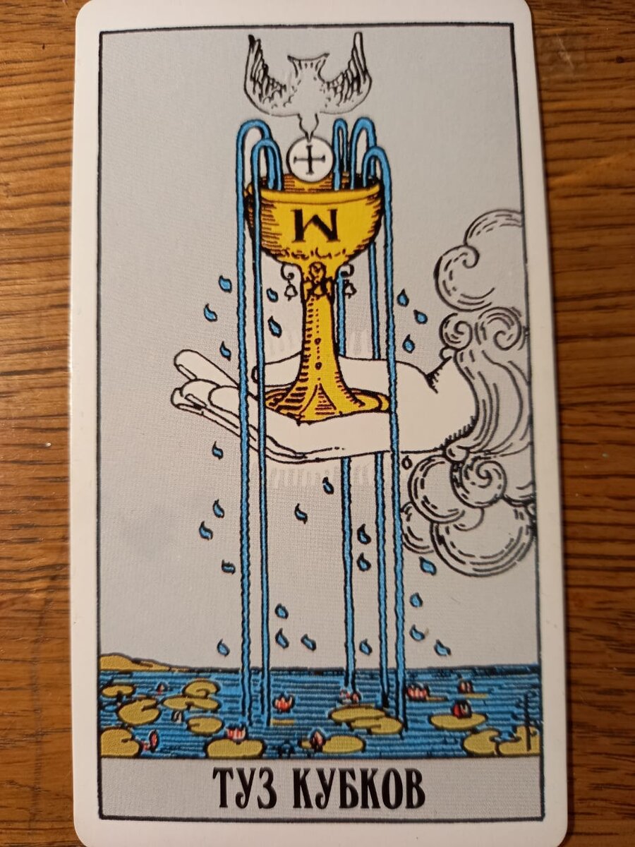 Если посмотреть на карту, мы увидим голубя, вкладывающего дар в кубок, из которого вытекает вода, наполняющая водоем с лотосами. Все это появляется из неоткуда. Первозданность, начало, чистота, основа основ.