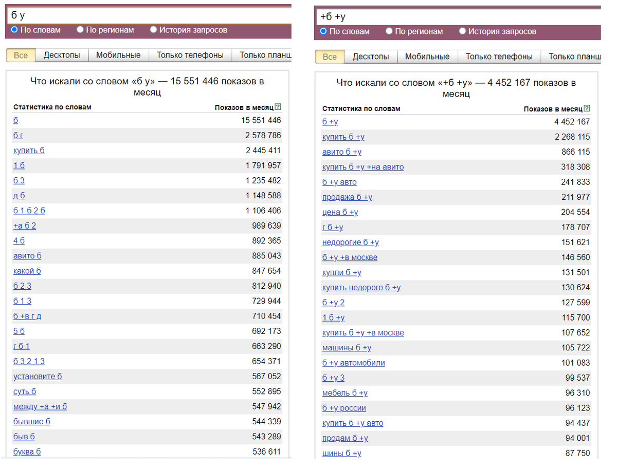 Если не зафиксировать оба сокращения +б +у, объявления будут показаны в т.ч. по нерелевантным запросам: