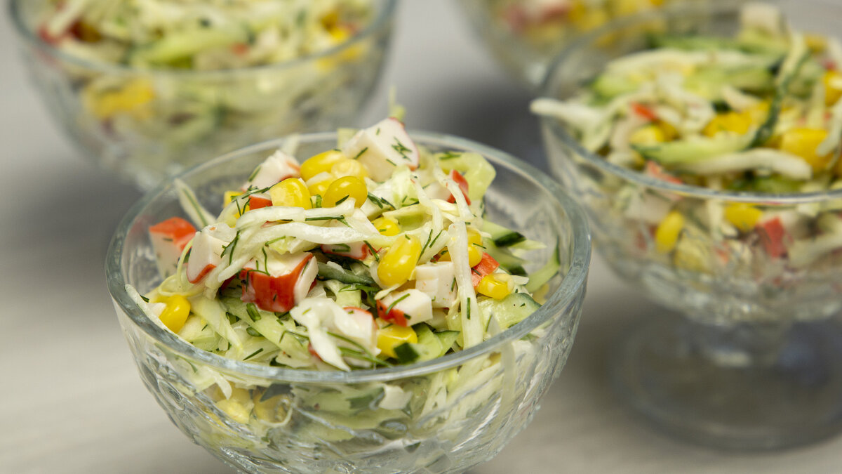 5. Смешиваем все нарезанные ингредиенты, добавляем консервированную кукурузу, соль по вкусу. Заправляем салат майонезом и перемешиваем