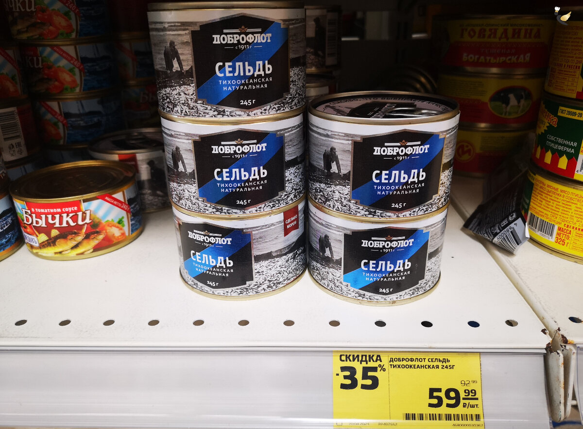 Я не ярый поклонник консервов, но все же иногда покупаю рыбные на салат. Недавно зашел в супермаркет, набрал в корзину продуктов по списку и проходя мимо прилавка с консервами увидел, как люди разбирали селедку "Доброфлот" по акции за 59,99 рублей.