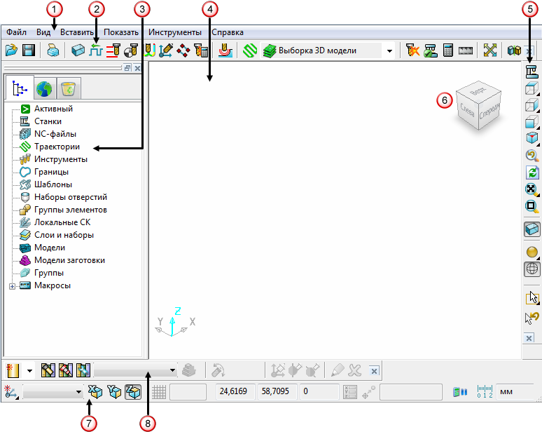 Начнем знакомится с программой PowerMill. И для начала немного определений. PowerMill - это ведущий мировой программный продукт NC CAM для изготовления сложных форм, часто встречающихся в инструментальной, автомобильной и аэрокосмической промышленности. Основные особенности: И так, после запуска программы, мы видим следующее окно Экран разделен на следующие основные области: Проводник Проводник показывает объекты, используемые в проекте PowerMill. Объекты в Проводнике группируются вместе по типу. Например, траектории группируются в ветвь Траектории, а инструменты группируются в ветвь Инструменты. Так как проект PowerMill часто содержит множество объектов, проводник использует систему выделения Активный элемент, чтобы показать, какие объекты рассматриваются в данный момент. Как сделать объект активным Дважды щелкните по объекту, чтобы сделать его активным (нужно щелкать по значку, а не по имени объекта). Новый активный объект отображается полужирным шрифтом с угловой стрелкой (>