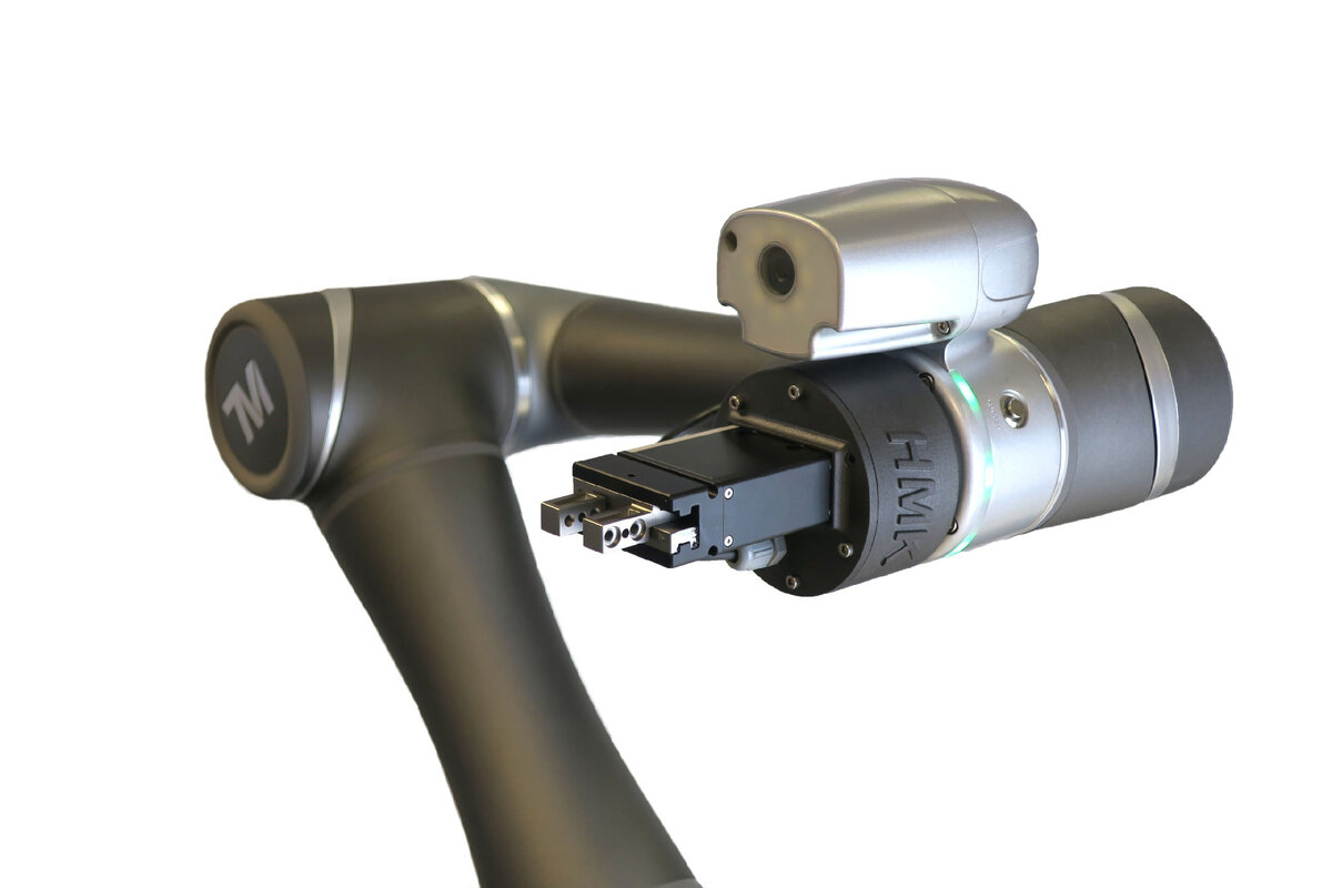 Техническое зрение коллаборативного робота Techman бывает двух видов – встроенное и внешнее. Встроенное техническое зрение Встроенным техническим зрением (то есть таким, которое есть даже в самой базовой комплектации) не может похвастаться практически ни один производитель коллаборативных роботов. Встроенную камеру называют «Eye-in-Hand». С помощью неё коботы TM Robot могут анализировать визуальную информацию об объектах, находящихся в поле зрения камеры. Камера понимает, какого размера предмет, каков его внешний вид (цвет, состояние поверхности и т.п.), расположение в пространстве, есть ли маркировка и что на ней нанесено. Все эти данные позволяют коллаборативому роботу принять решение, какое действие совершить по отношению к объекту. Без технического зрения не обойдется ни одна задача, включающая, например, сортировку изделий или контроль качества. Внешние камеры Помимо встроенной камеры к коботу TM Robot можно подключить внешние. Они помогают расширить зону видимости. Дополнительные