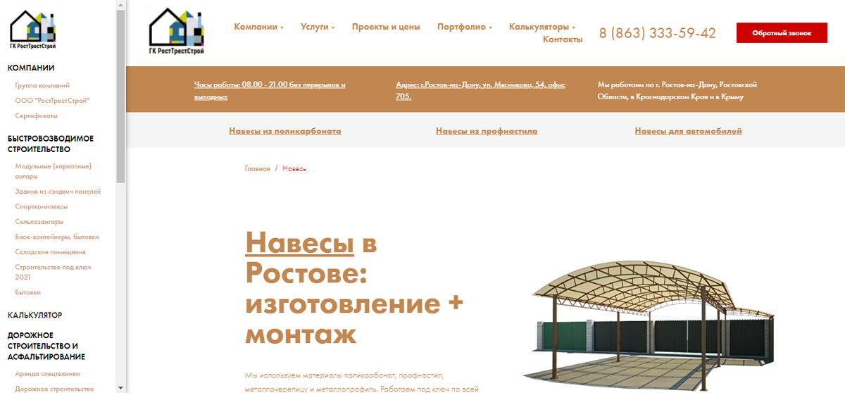 Как это обычно и бывает, вначале у клиента нет своего портфолио, поэтому взял фотки из интернета. Это нехорошо морально, этически и слабо эффективно с точки зрения маркетинга, но если своих работ нет, все равно надо, чтобы клиент хоть на что-то посмотрел. 70% клиентов поймут, что это «левак» и с сайта уйдут, но будут и те, кто торопится и много рассматривать фотографии на сайте не будет, а введет в Яндексе «навесы из поликарбоната» или «навесы ростов цена», быстро перейдет на сайт и позвонит. На таких клиентов и вся надежда на первых порах. В итоге у нас все сработало. Уже через 5-6 месяцев все «левые» фотки на сайте мы заменили на свои, настоящие, «авторские», с указанием адресов, параметров строительства, размеров, стоимости.