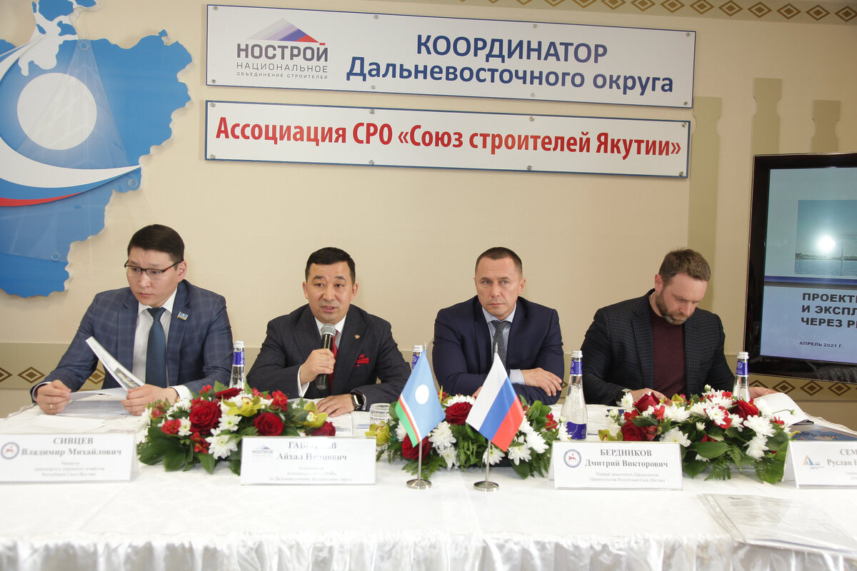 Совещание по вопросам участия строительных, дорожно-строительных, производственных и транспортно-логистических организаций в реализации проекта «Проектирование, строительство и эксплуатация мостового перехода через реку Лену в районе города Якутска» состоялось на площадке Ассоциации СРО «Союз строителей Якутии» у координатора Национального объединения строителей (НОСТРОЙ) по Дальневосточному федеральному округу Айхала Габышева. В работе совещания приняли участие: первый заместитель председателя Правительства Республики Саха (Якутия) Дмитрий Бердников, министр транспорта и дорожного хозяйства Республики Саха (Якутия) Владимир Сивцев, и.о. председателя Госкомзанятости Якутии Елена Калашникова, генеральный директор ООО «Производственная фирма «ВИС» Руслан Семенов, исполнительный директор ООО «Восьмая концессионная компания» Иван Кондуб, генеральный директор Государственного казенного учреждения Республики Саха (Якутия) «Дирекция по строительству Ленского моста» Артём Артемьев, а также пре